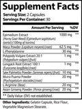 Ingredients: Horny Goat Weed Extract, Maca Root Powder, Mucuna Pruriens 15% L-Dopa, Polypodium Vulgare Powder, Tongkat Ali Root Powder, Saw Palmetto Berry Powder, Muira Puama Root Powder, L-Arginine HCL, Panax Ginseng Root Powder, Gelatin Capsule, Rice Flour, Vegetable Magnesium Stearate.
